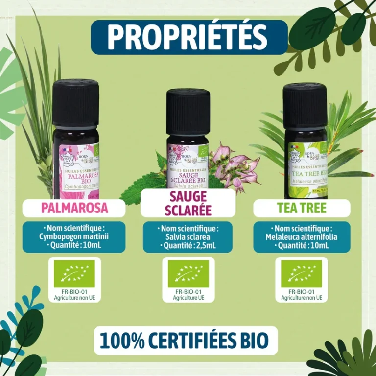 Trio d’huiles essentielles bio – Tea Tree, Sauge Sclarée et Palmarosa – idéal pour rafraîchir, purifier et équilibrer la peau du visage.